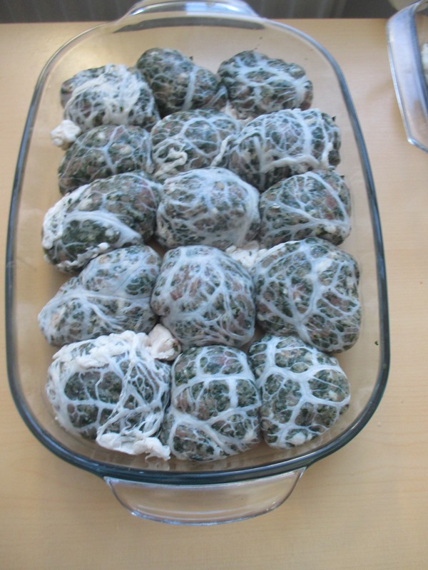 - Étaler la crépine, former une boule de préparation. Enrouler la boule dans la crépine. Couper le surplus de crépine.