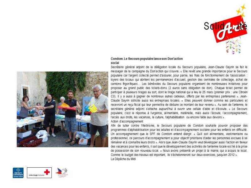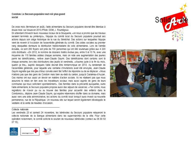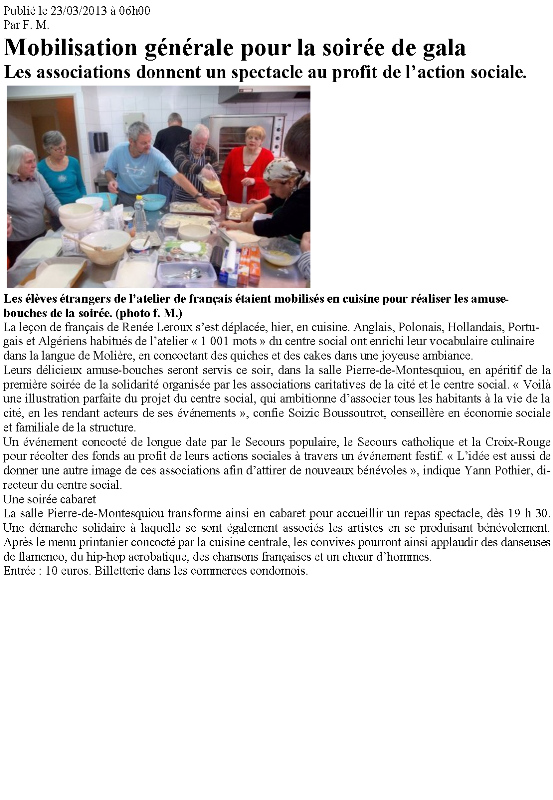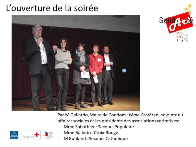 Le 23 Mars 2013 a eu lieu la première soirée Solid’Art’ité organisée par la Croix-Rouge, le Secours Populaire et le Secours Catholique.