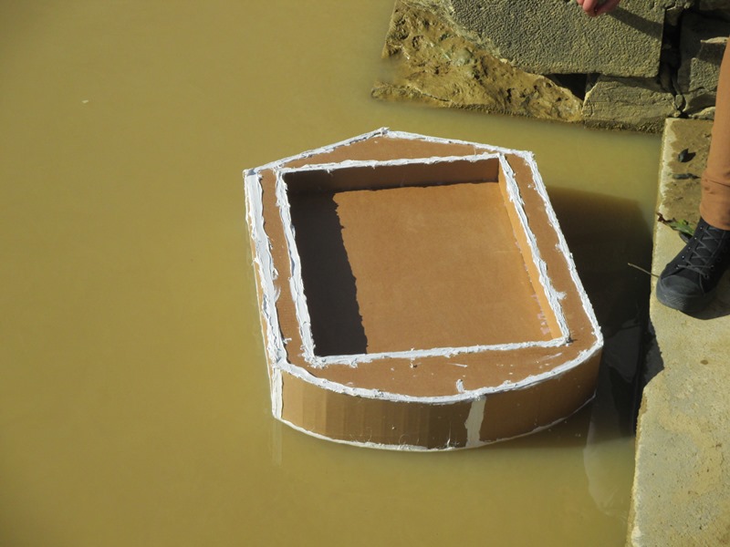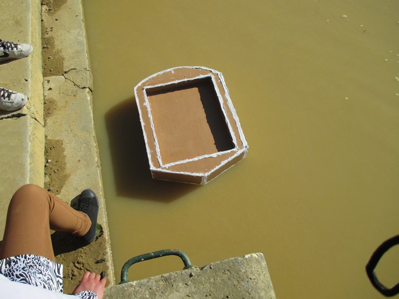 La maquette de leur bateau en carton enfin terminée, il est temps de la tester dans la Baïse. Après, cette opération réussie, il nous reste plus qu’à fabriquer le bateau à échelle humaine pour participer à la régate de bateau en carton du 24 Mai.