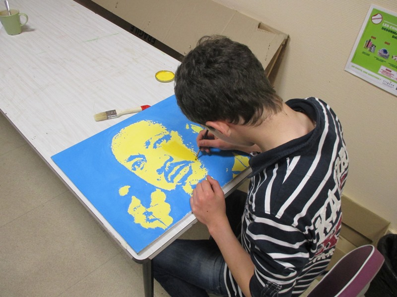 En parallèle, des travaux réalisés au collège sur les luttes contre les discriminations et les Hommes qui ont marqué l’histoire, les jeunes réalisent un tableau Pop’Art de Martin Luther King à la manière d’Andy Waroll et de sa Maryline.