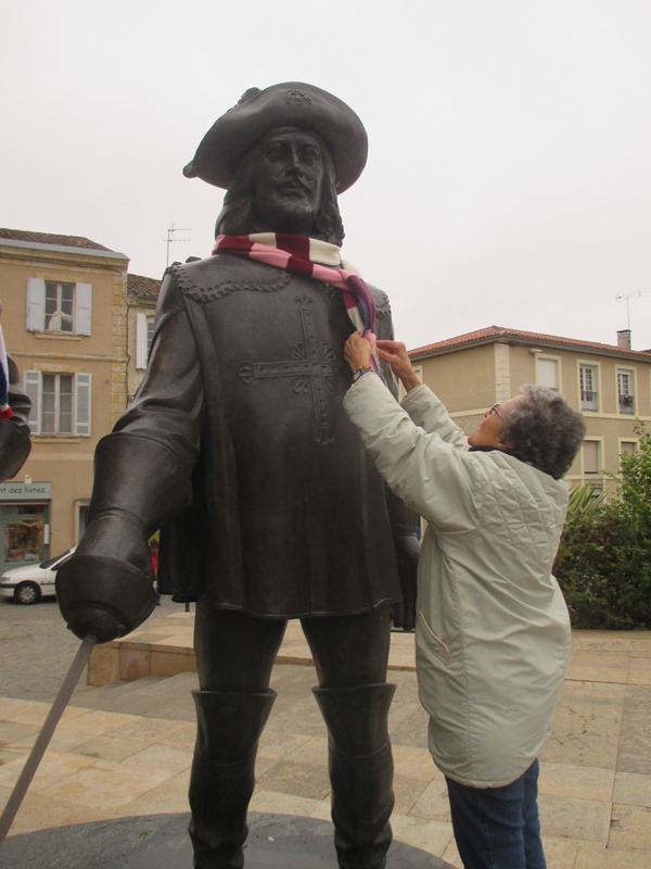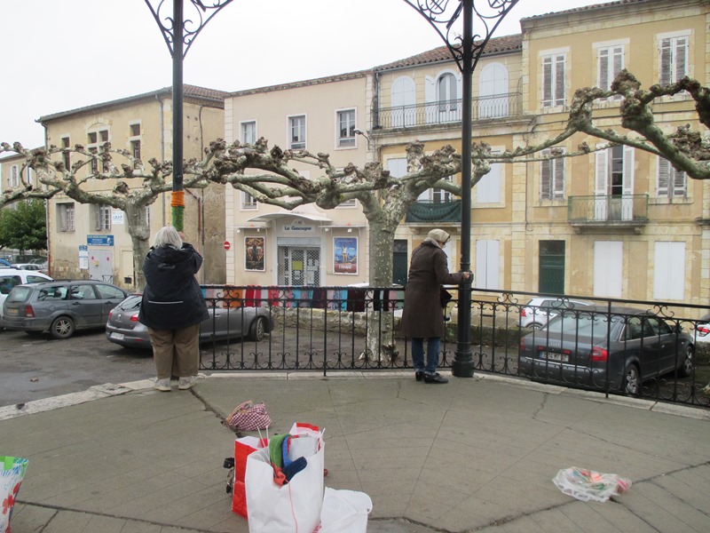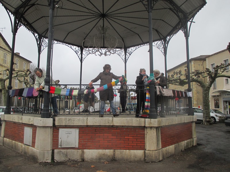 Dans un état d’esprit léger, la joyeuse bande a opéré le 10 décembre sous la pluie ! Après un mois de travail les réalisations été enfin prête à être accrochées au Kiosque des Allées et au cou des Mousquetaires de la place St Pierre. Une vingtaine de personne a participé à ce projet Condomois monté en partenariat avec le Service Culturel, Mme Gonzalez et l’Espace Gambetta. Les enfants de 1000 et 1 devoirs ont également apporté leur pierre à l’édifice en fabriquant des pompons. Le tricot urbain est resté accroché au kiosque jusqu’au 5 janvier.